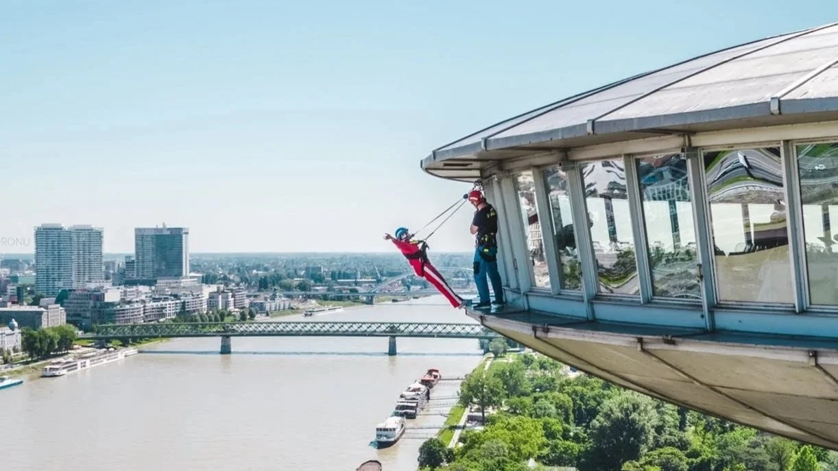 Loop rond op het UFO-vormige observatiedek hoog boven de Donau en geniet van een 360° uitzicht over Bratislava — spannend én prachtig tegelijk!